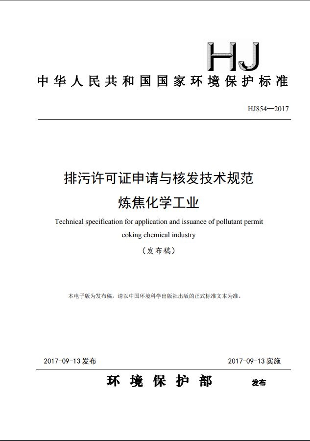 点击查阅 HJ854-2017 《排污许可证申请与核发技术规范 炼焦化学工业》标准全文内容