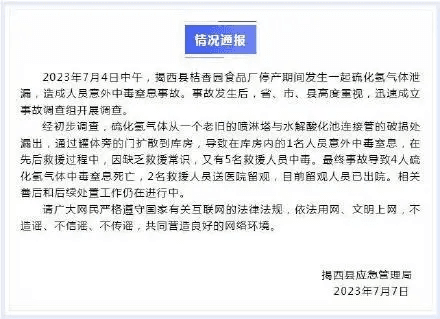 2023年7月4日中午,揭西县桔香园食品厂停产期间发生一起硫化氢气体泄漏,造成人员意外中毒窒息事故。经初步调查,硫化氢气体从一个老旧的喷淋塔与水解酸化池连接管的破损处漏出,通过罐体旁的门扩散到库房,导致在库房内的1名人员意外中毒窒息,在先后救援过程中,因缺乏救援常识,又有5名救援人员中毒。最终事故导致4人硫化氢气体中毒窒息死亡,2名救援人员送医院留观,目前留观人员已出院。相关善后和后续处置工作仍在进行中。