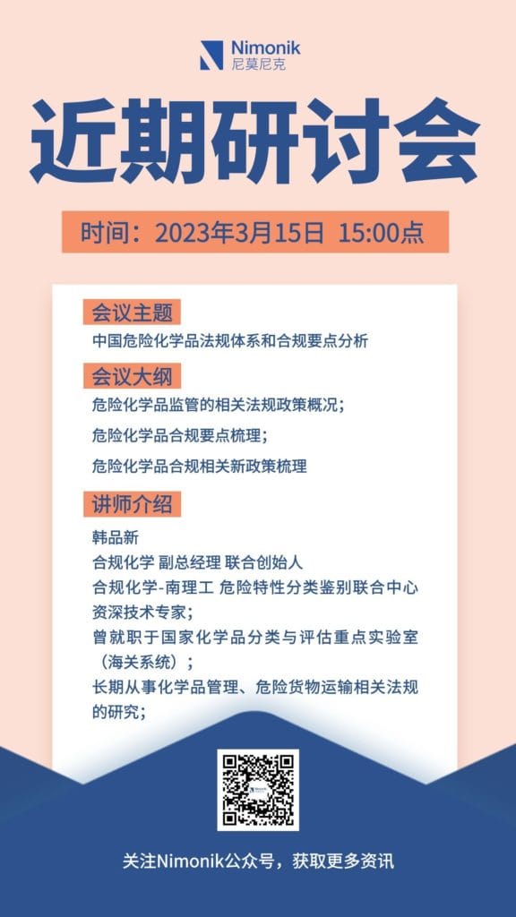 线上研讨会|中国危险化学品法规体系和合规要点分析 6 3 月, 20233 3 月, 2023 作者 Benjamin Chen 点击图片,注册本次研讨会 如遇无法注册,请邮件至 info@nimonik.com,联系我们。