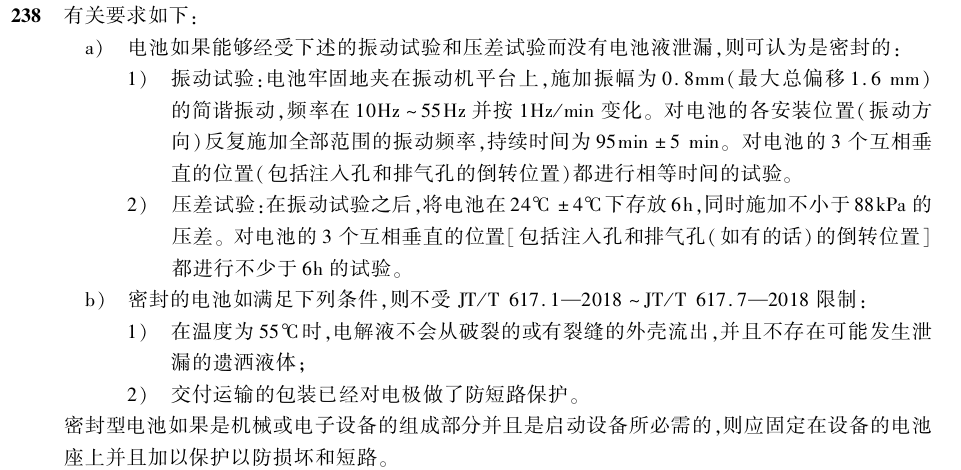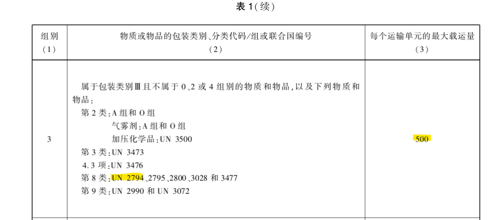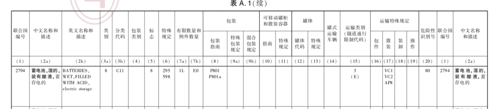 - 符合UN2794要求的铅酸蓄电池,依据危险货物道路运输规则 第3部分:品名及运输要求索引 – JT/T 617.3—2018表A(截图如下),有限数量1L,例外数量不适用。