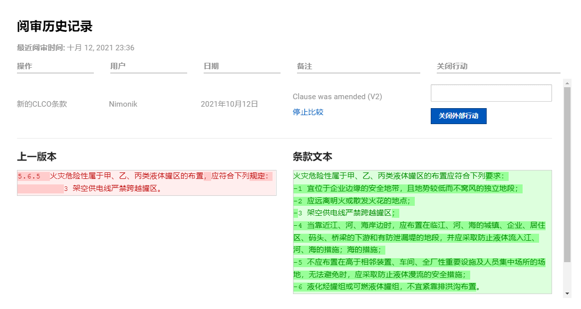 - 条款比较(仅限条款更新行动):这将允许您在更新条款的当前版本和先前版本之间进行红线比较。