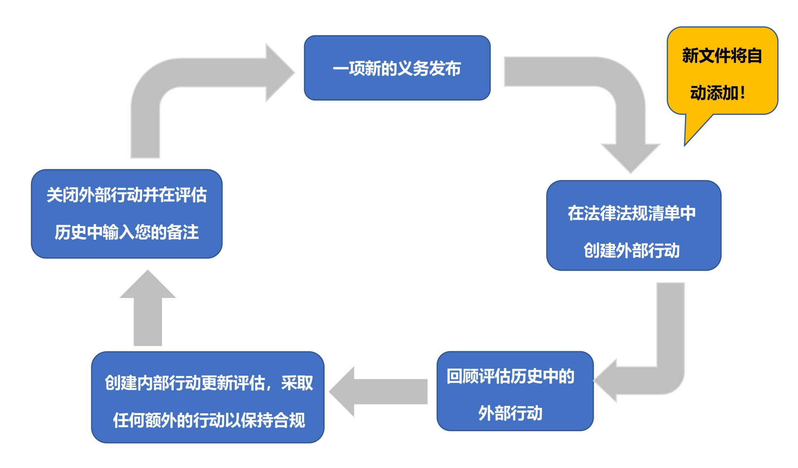 当您的法律法规清单中的文件和条款更新时,责任方会收到外部行动提醒。 本文将向您展示: