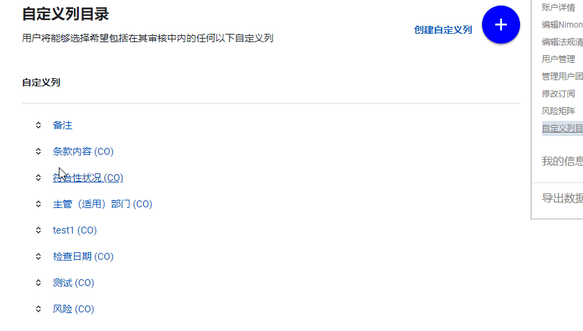自定义列在目录页面上出现的顺序(从上到下)将决定它们在 CO 和 CLCO(从左到右)和(即将推出)审核模板(从上到下)中出现的顺序。