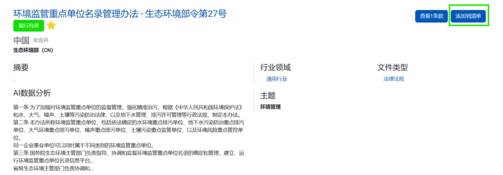 • 单击保存将文件添加到一个或多个法规清单列表中