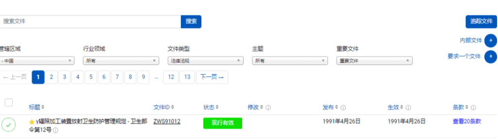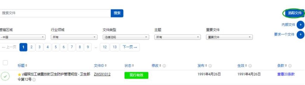法规库根据客户的订阅和上传的内部文件,显示了Nimonik数据库中适用于客户的所有文件。