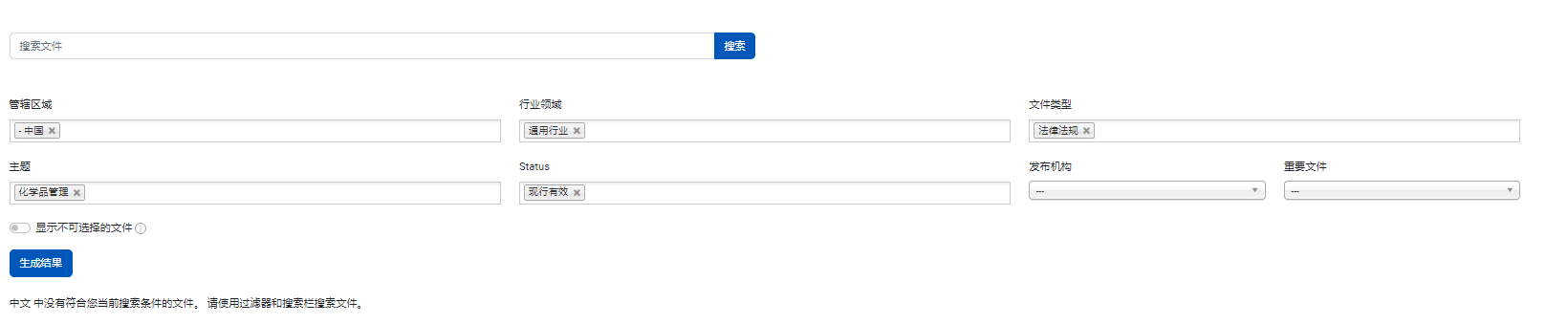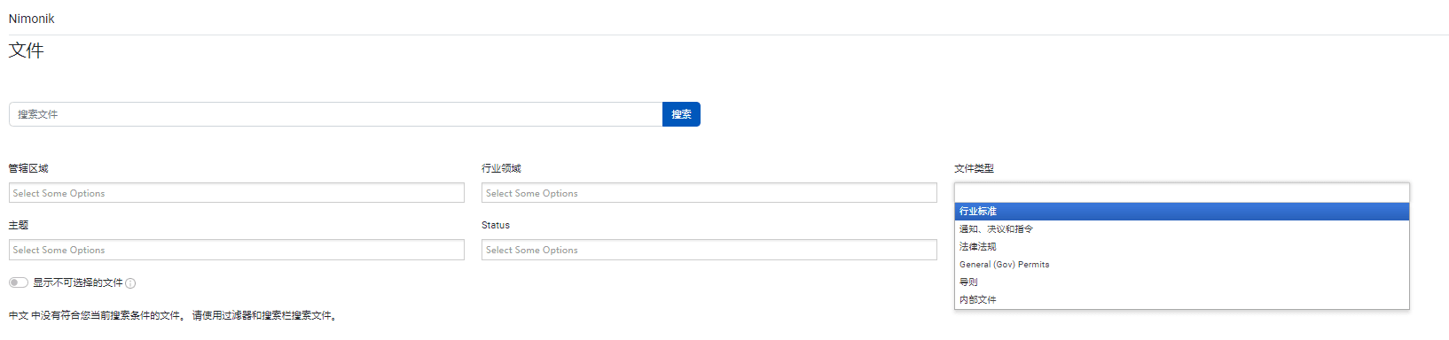 当您第一次打开法规库页面时,将看不到任何文件。 使用过滤器和搜索栏查找您要查找的文件。